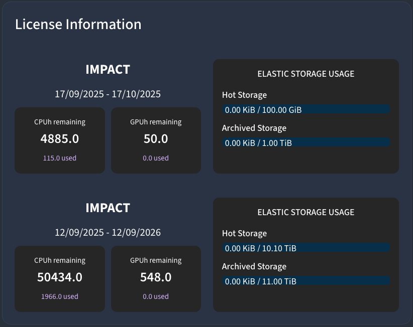 - GPU usage is tracked in the same way as CPUh, displayed as remaining vs. used GPUh.