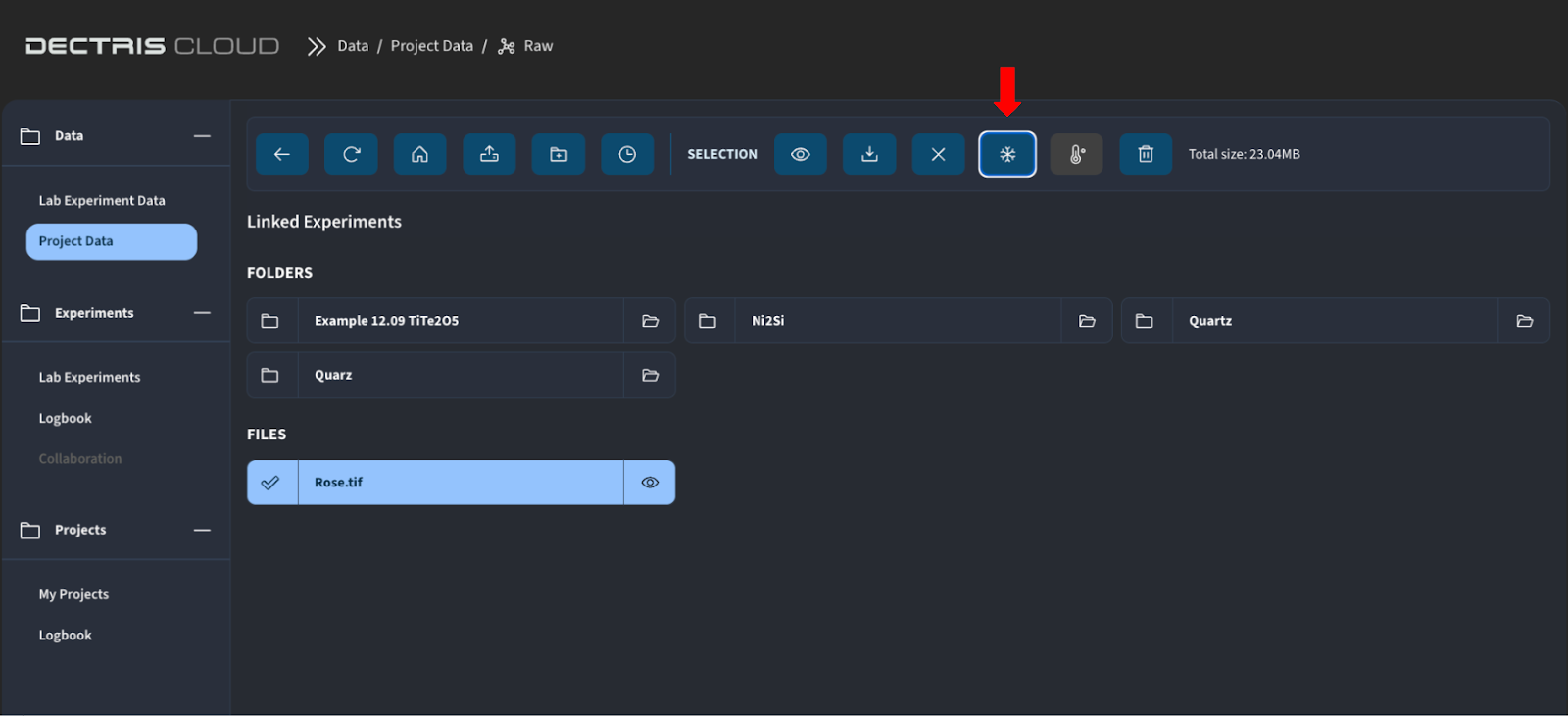 The Data space at app.dectris.cloud is a central area to all data associated to one's account. From experimental data to project data, all is organized in a comprehensive structure with a user-friendly file browser.