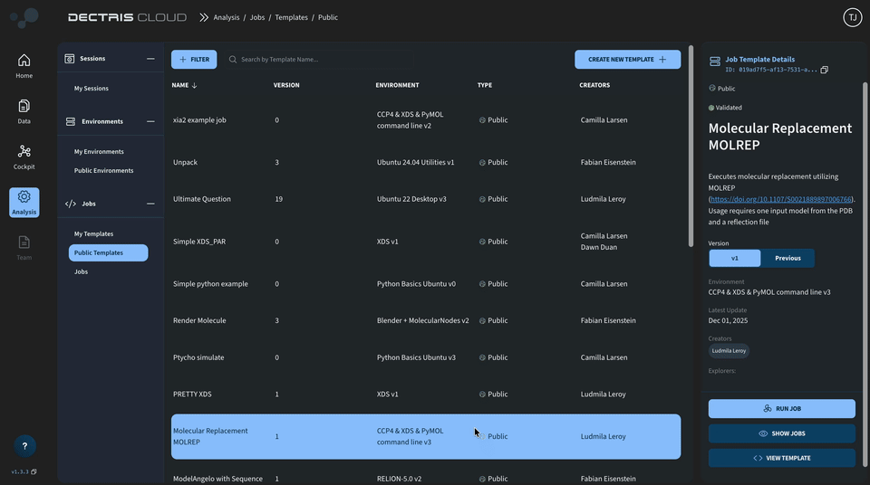 This job template illustrates how MOLREP can be run as a job on DECTRIS CLOUD using a configurable command-line workflow. The template is built on the CCP4 & XDS & PyMOL command line environment and is executed in a non-interactive batch setting.