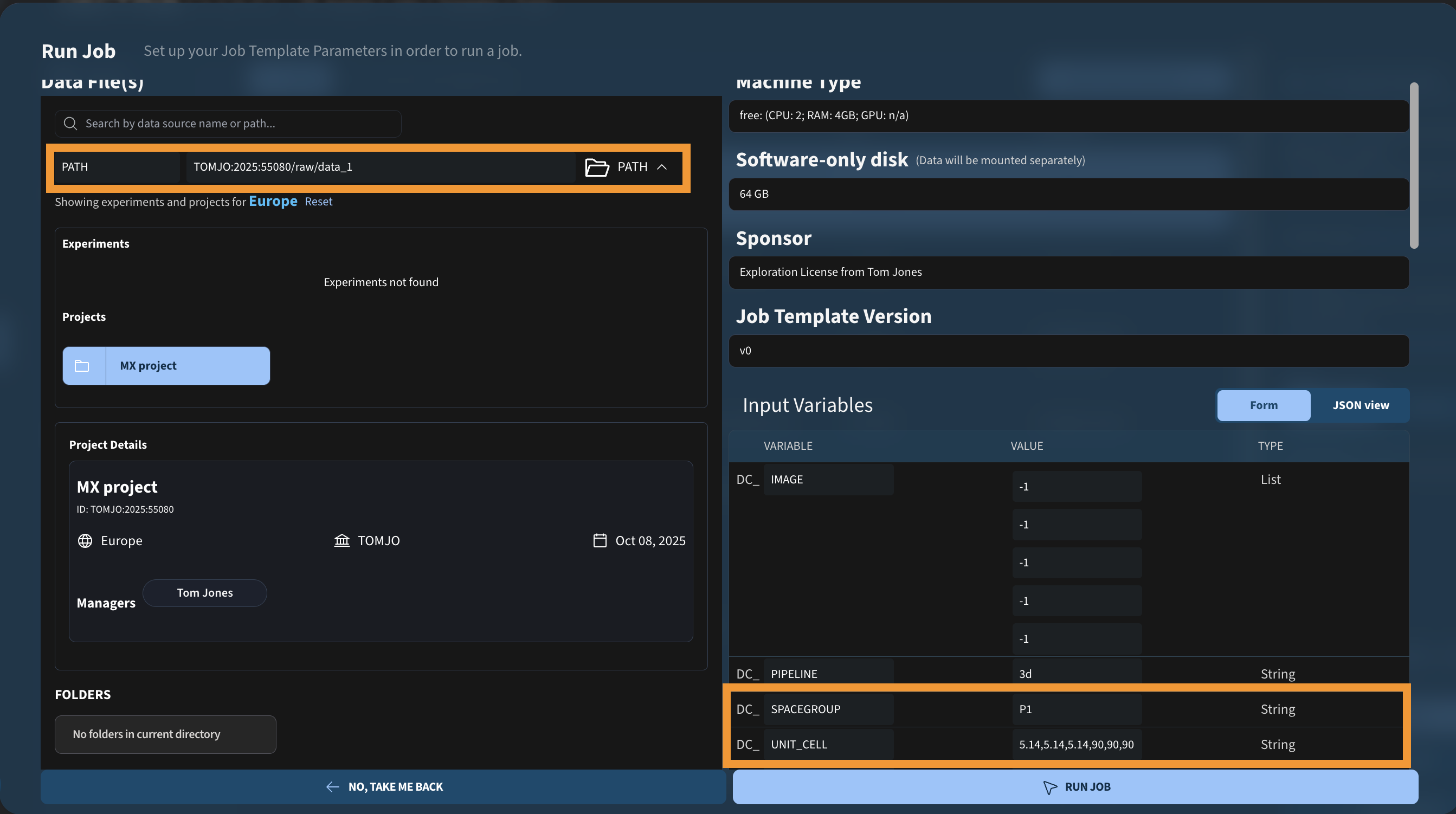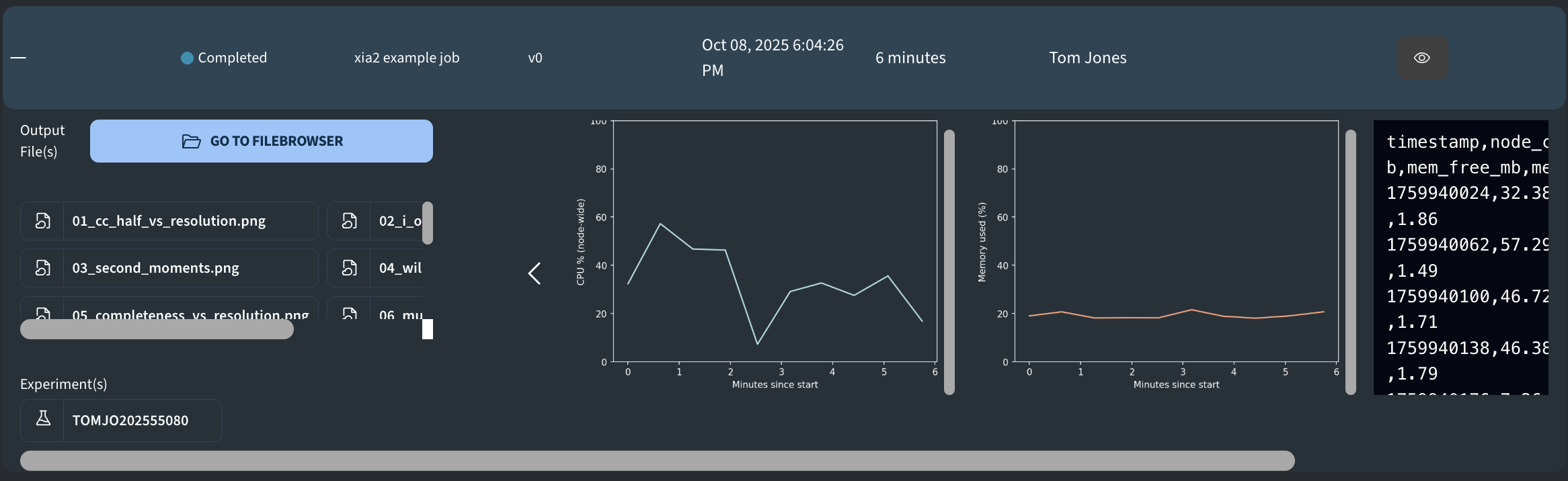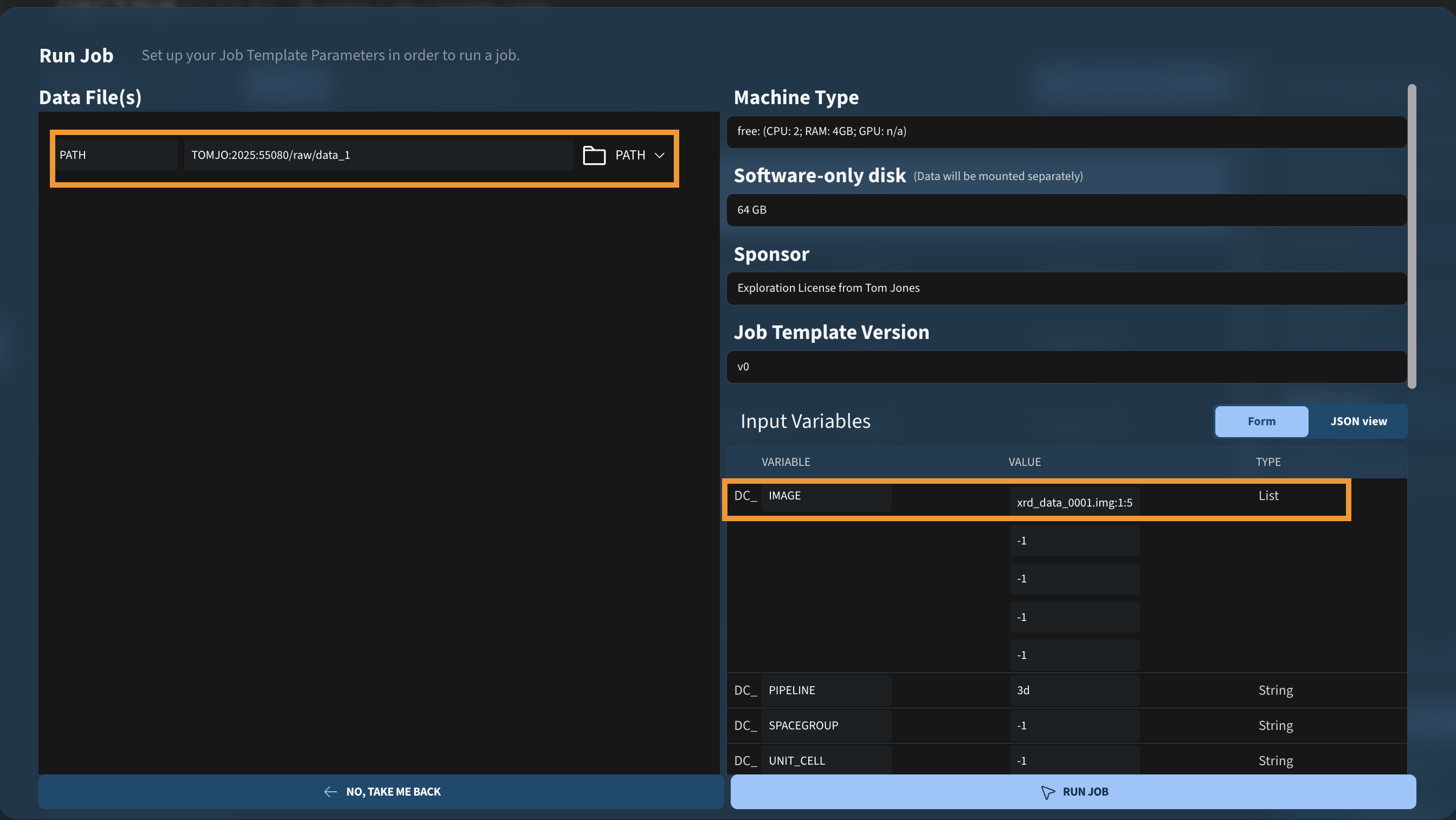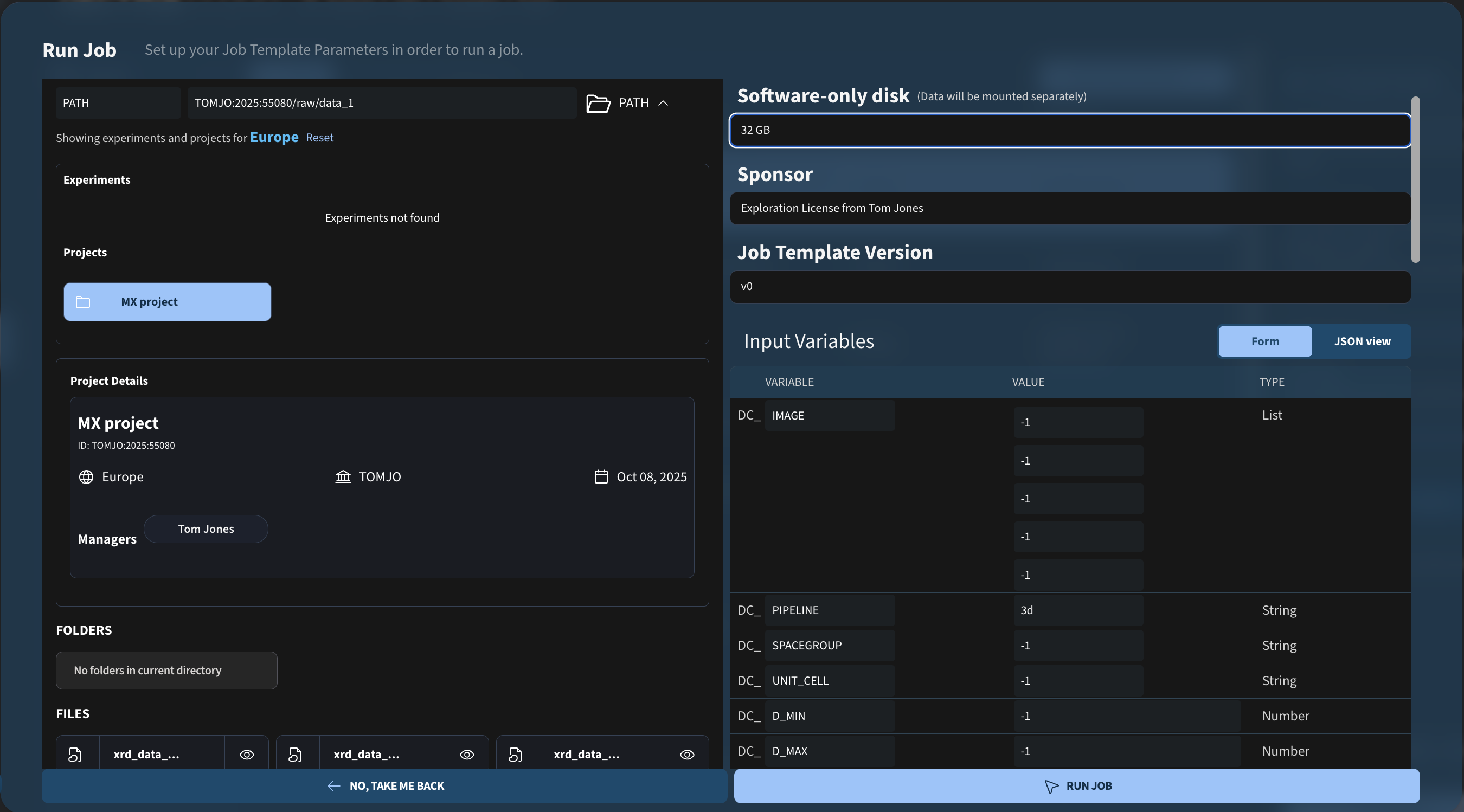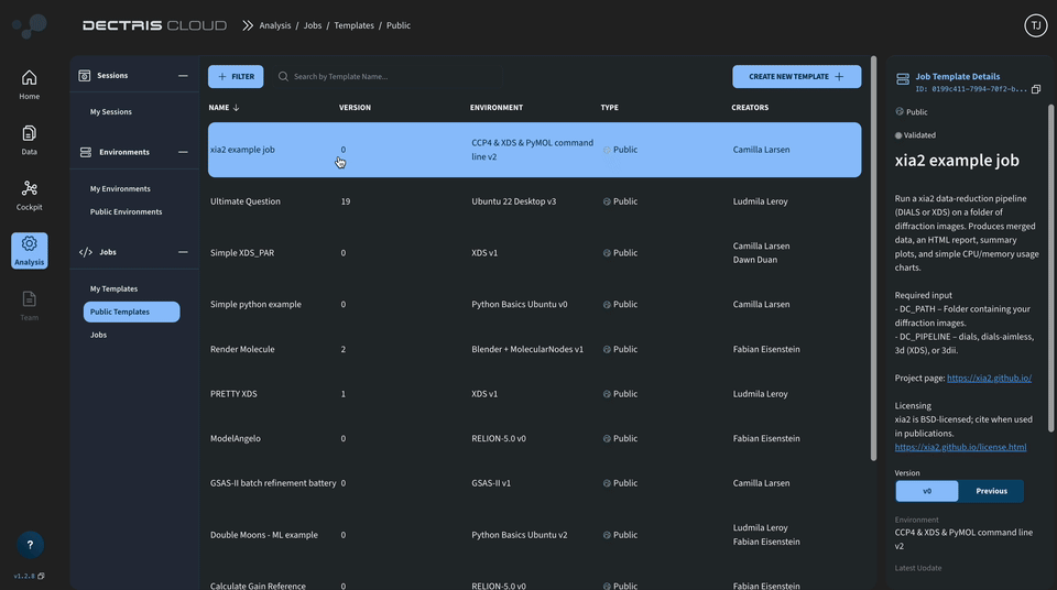 This example job template exemplifies how xia2 can be run as a job on DECTRIS CLOUD with configurable input and machine performance types. The job template has been built with the CCP4 & XDS & PyMOL command line environment. You point it to an image directory, choose a pipeline (dials